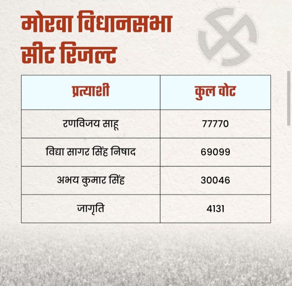 मोरवा से रणविजय साहू(RJD) की जीत: मोरवा विधानसभा सीट कई मायनों में खास था. इस सीट से एनडीए, महागठबंधन के अलावे जन सुराज ने पूर्व मुख्यमंत्री कर्पूरी ठाकुर की पोती को मैदान में उतारा था, लेकिन उन्हें कामयाबी नहीं मिली. मोरवा से राजद के प्रत्याशी रणविजय साहू की जीत हुई. दूसरे नंबर पर जदयू के विद्या सागर सिंह निषाद रहे. कर्पूरी ठाकुर की पोती चौथे स्थान पर चली गयीं. तीसरे स्थान पर निर्दलीय प्रत्याशी अभय सिंह रहे.
